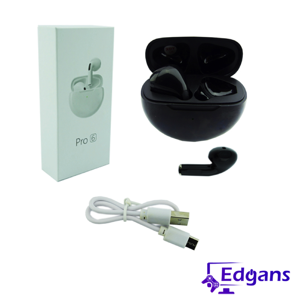 Audífonos true wireless bluetooth modelo PRO 6, con estuche y cargador magnético, ideales para contestar llamadas o escuchar música de forma inalámbrica. Incluye cable de carga y manual de usuario