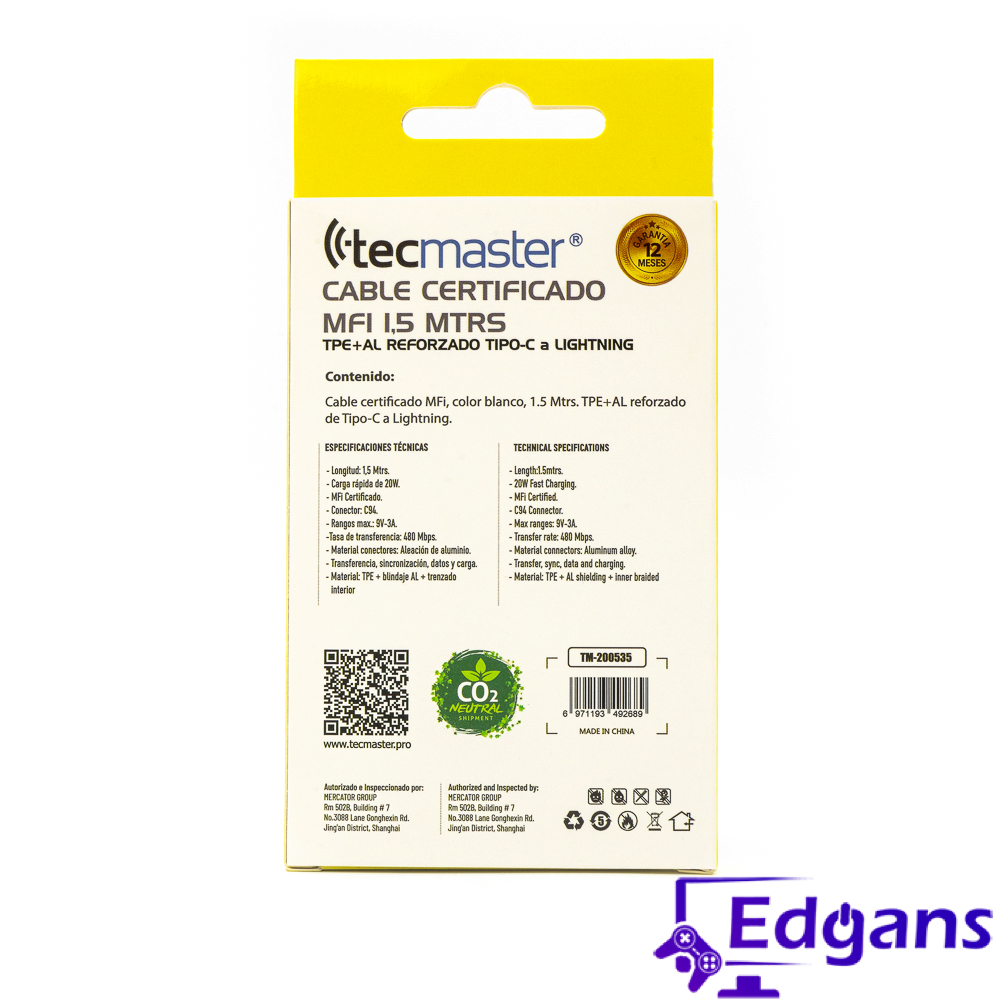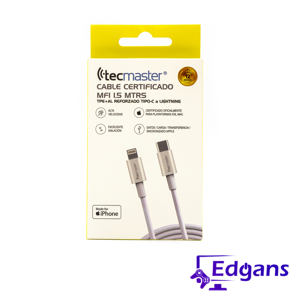Cable Certificado MFi, chip Conector C94, soporta carga rápida, rangos máximos de carga compatibles, 9V 3A – 20W. Velocidad de transferencia: 480 Mbps. Material conectores: Aleación de aluminio. Compatibles con Transferencia, sincronización, datos y carga. Material: TPE+ blindaje AL + trenzado interior.