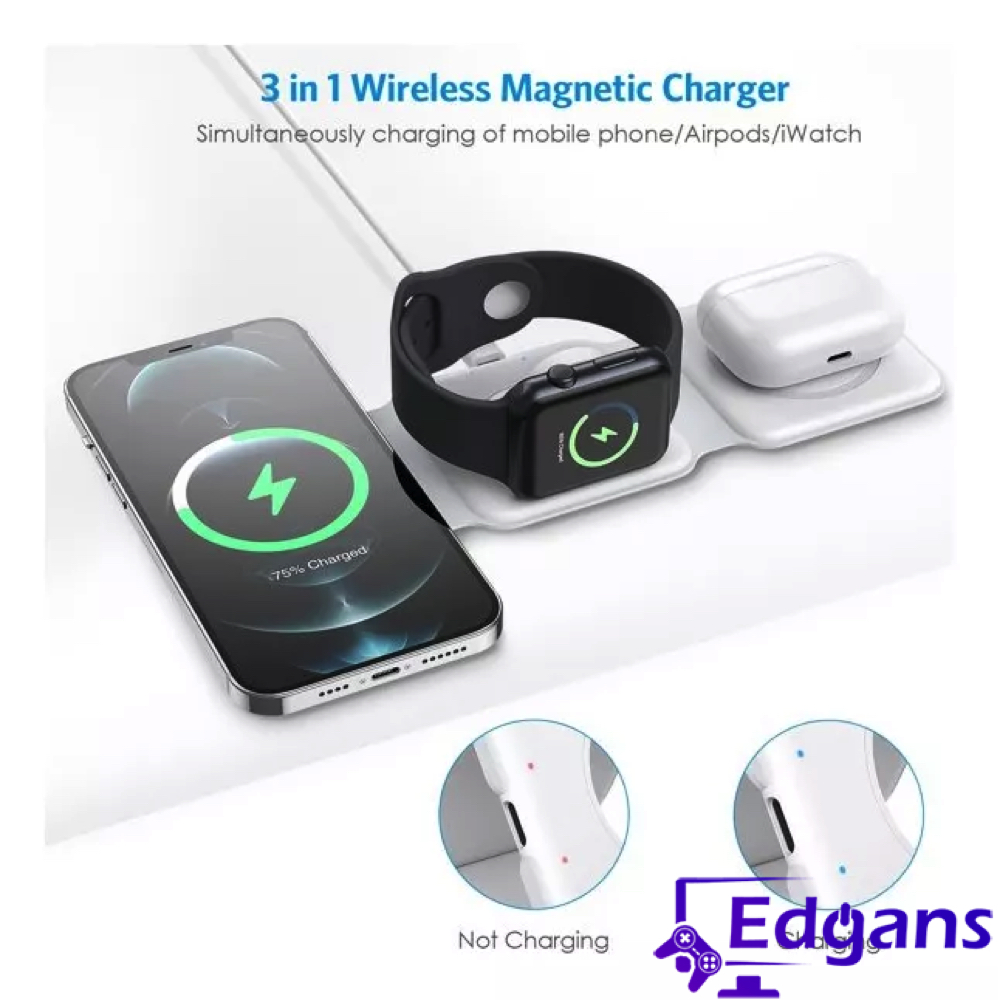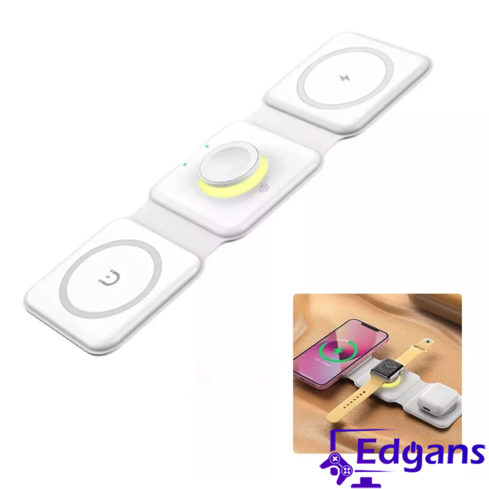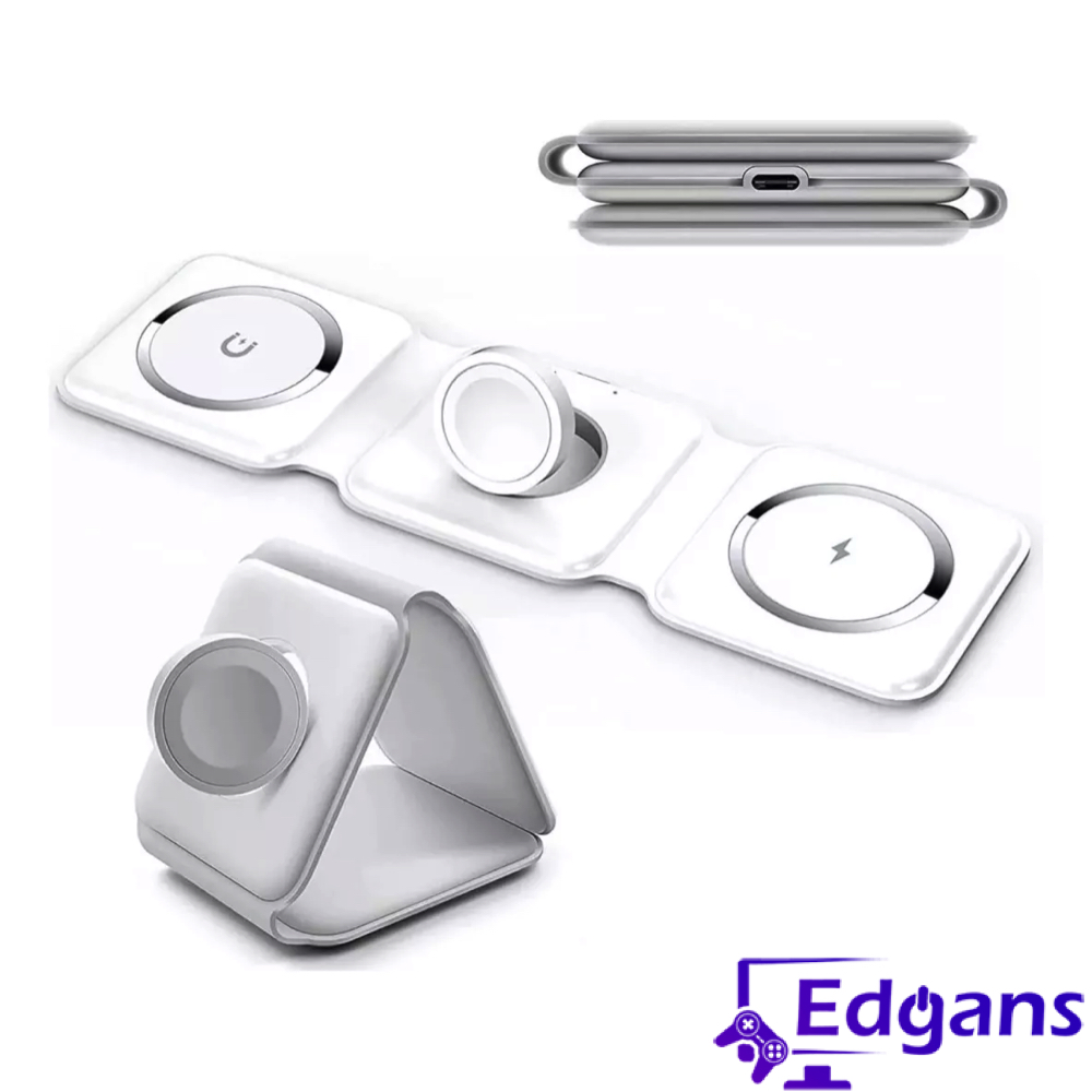 Cargador inalámbrico 3 en 1 está diseñado para ser una estación de carga integral compatible con MagSafe, dispositivos Lightning, Smartwatch, audífonos y smartphones. Ofrece una solución de carga sin cables para varios dispositivos simultáneamente, con áreas específicas para cada tipo de dispositivo, asegurando una carga rápida y eficiente.