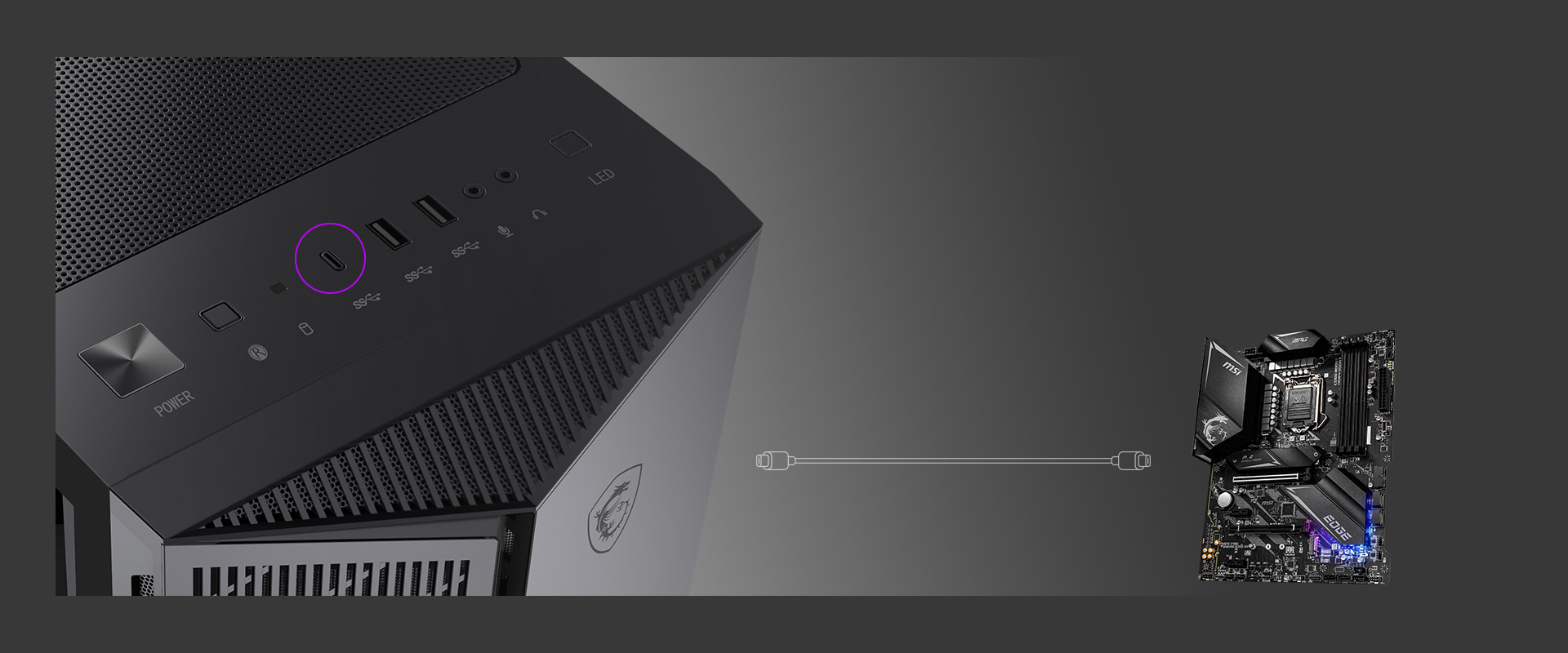 MPG GUNGNIR 110 con una placa madre MSI incluye un puerto USB Tipo C para un acceso más conveniente. Completa el sistema gaming MSI con una tarjeta gráfica y un sistema de refrigeración por líquido.