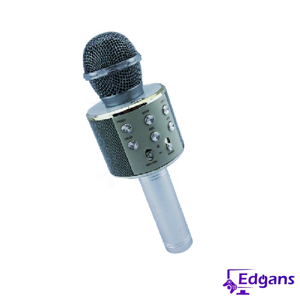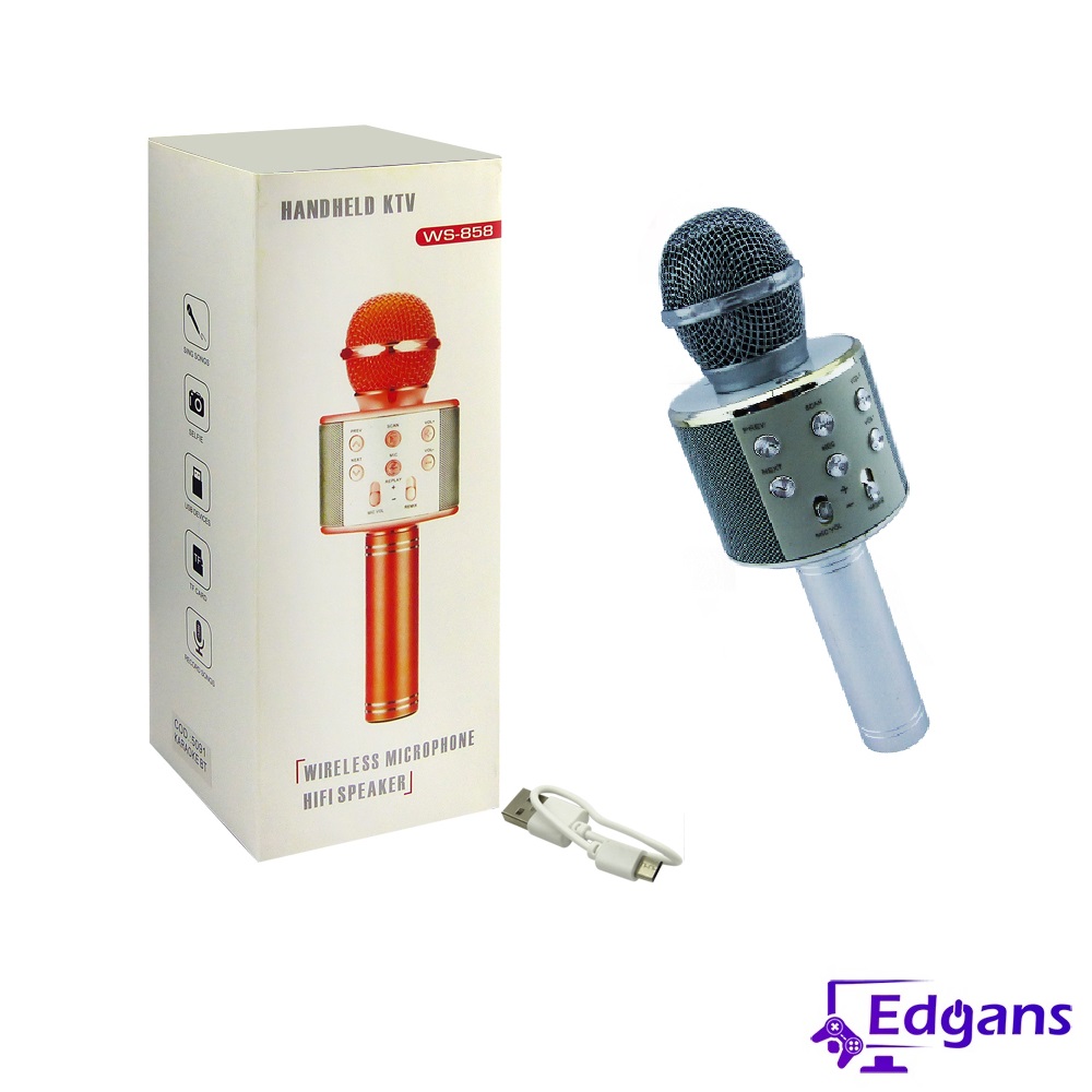 Micrófono Bluetooth modelo WS-858, cuenta con USB, AUX, ranura micro SD, Karaoke. El micrófono puede reproducir música Mp3 por USB o Micro SD/TF. Batería interna recargable.