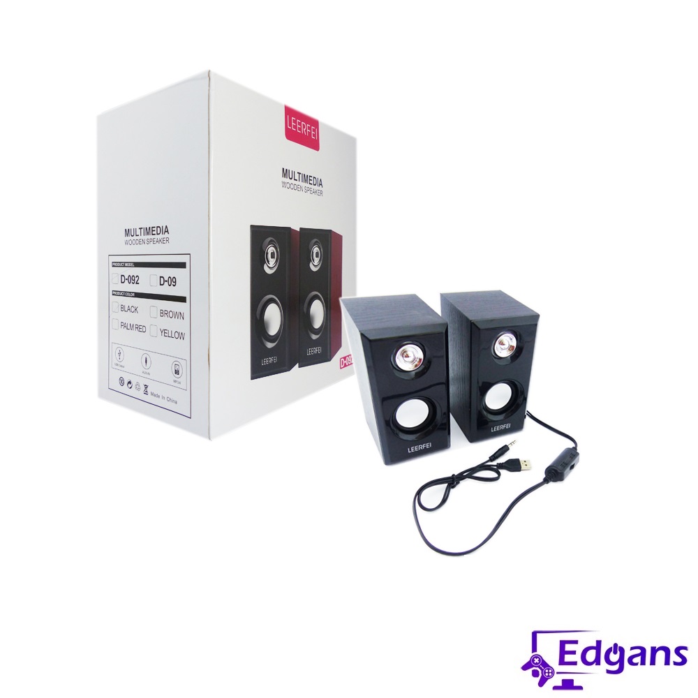 Parlante marca LEERFEI, modelo D-092, ideal para PC, cuenta con alimentación por USB, conexión plug 3,5mm y regulador de volumen integrado en su cable