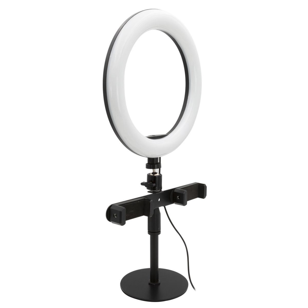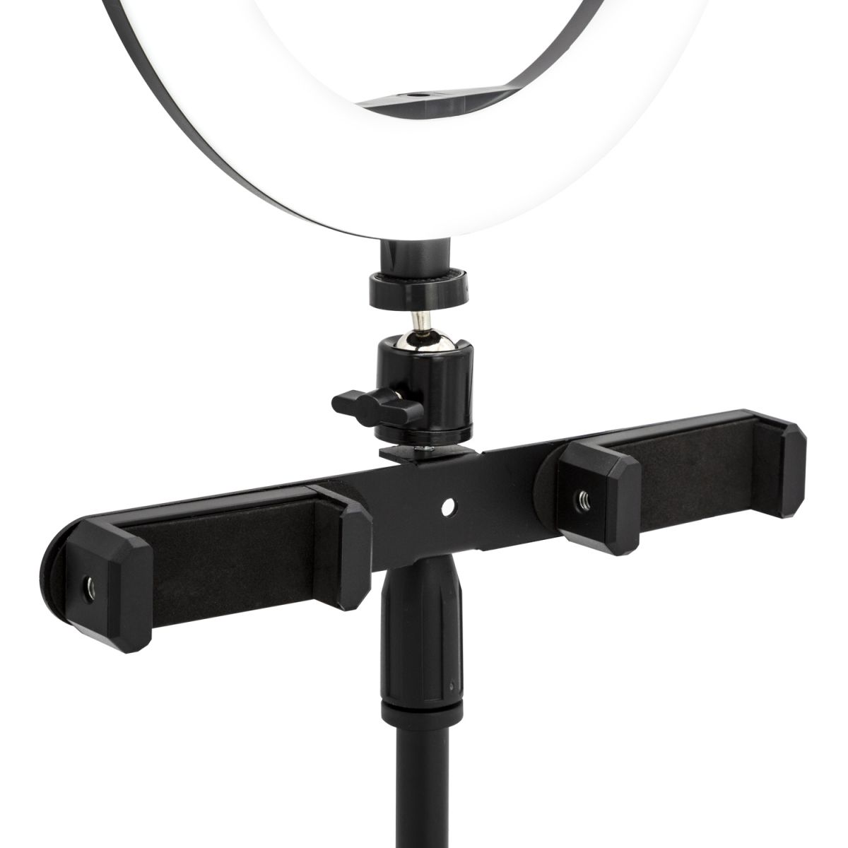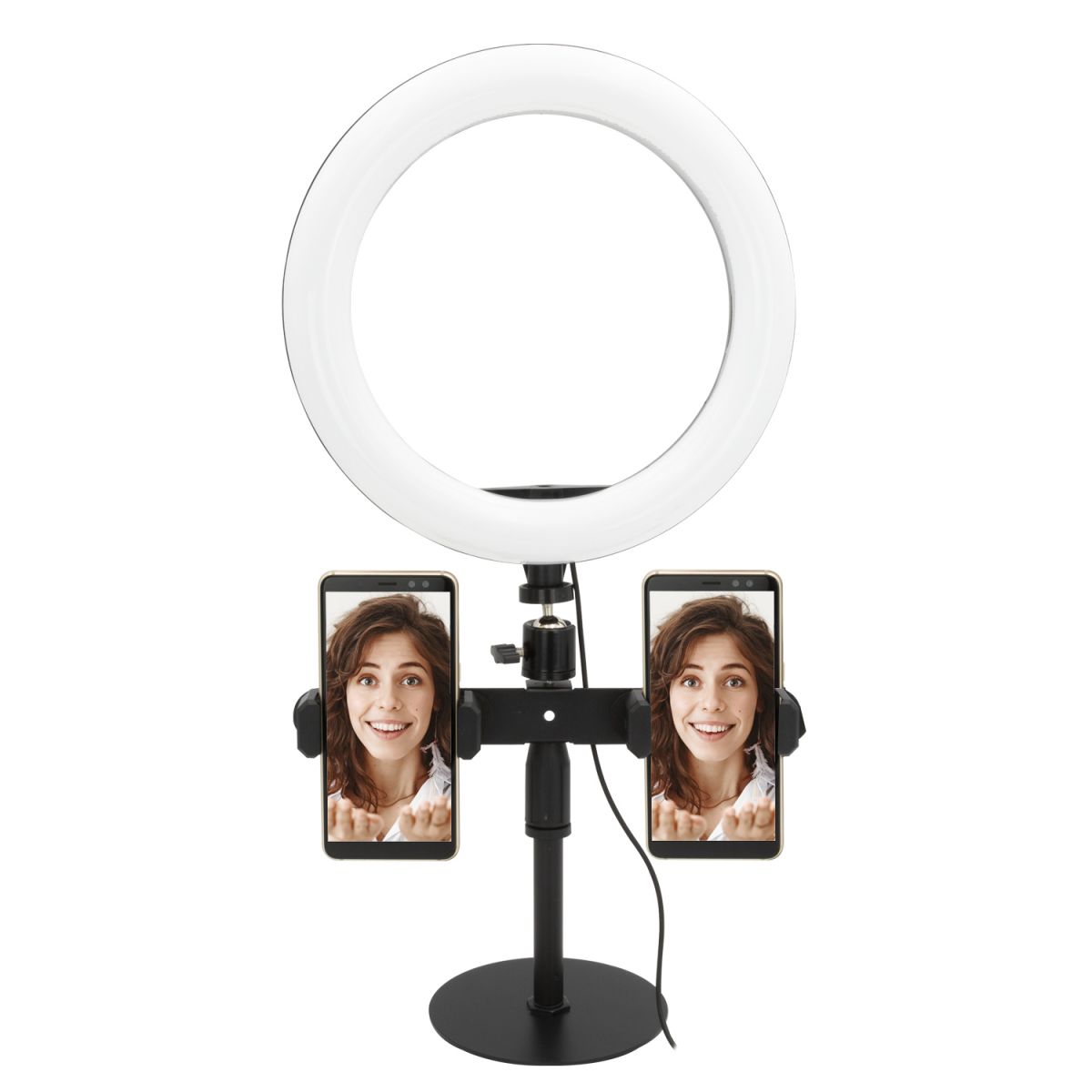 Recomendado para uso con smartphone en fotografía de retrato, maquillaje, peluquería, el Pack ringlight aro de luz de 30 cms con soporte de sobremesa y uso de hasta 2 smartphones a la vez, suaviza el tono de la piel, dejando un cutis terso, creando un efecto profesional de haz luminoso circundante alrededor de los ojos.